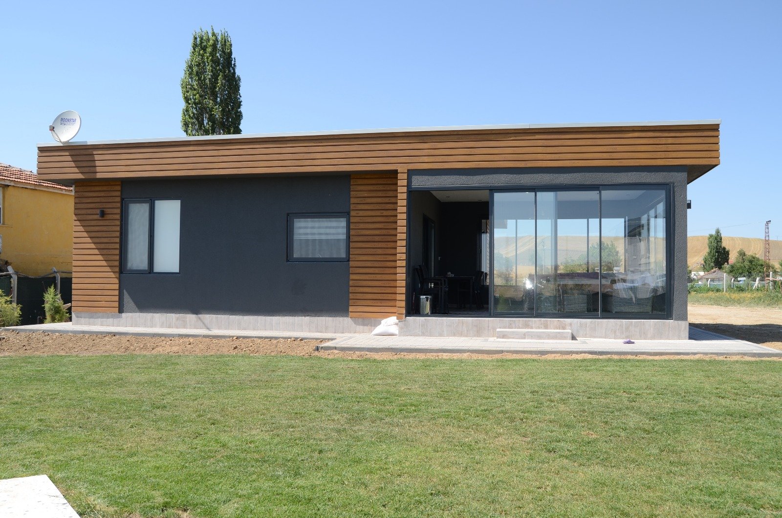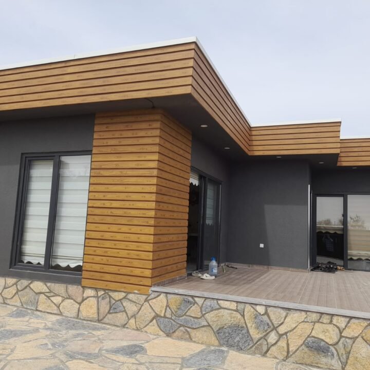Projede özellikle dış cephe tasarımı öne çıkıyor. Ahşap kaplama detayları ve koyu renkli modern cephe boyası bir araya gelerek çağdaş bir görünüm kazandırıyor. Geniş cam pencereler ve sürgülü kapılar, iç mekânlara bol miktarda doğal ışık girmesini sağlarken, evin bahçeyle bütünleşmesini kolaylaştırıyor. Bu sayede hem ferah bir iç mekân deneyimi hem de doğayla iç içe bir yaşam tarzı oluşturuluyor.